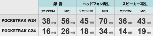 POCKETRAKの魅力はなんといってもその薄くて小さなボディ。重さはW24が92g、C24が57g。ポケットに入れて持ち運べ、すぐ録音ができる。内蔵スピーカーですぐに内容を確認できるのも便利。バッテリはアルカリ電池で、それぞれ単三乾電池(W24)と単四乾電池(C24)使用。最長で56時間(W24)、26時間(C24)の録音が可能とスタミナ面でも心強い。