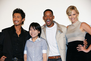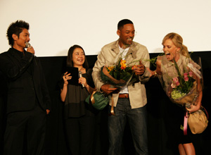…と突然マスコミからカメラを借りて客席を撮ろうとするウィル。そこへ「私を撮らないの?」とポーズを撮ってツッコむシャーリーズ。ウィルが客席に向かってカメラを向けると、お客さんもポーズをとりシャーリーズも思わず「GOOD JOB!」と劇中のハンコックの台詞で褒めた。