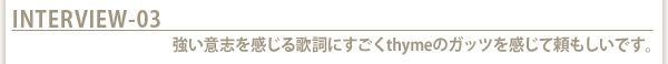 thyme:私は完全にカラオケ世代だと思うんですが、今は私がカラオケで歌われる側になってるんですね。で、カラオケにいった女の子たちが家で練習したり真似したりしたくなるようなヴォーカリストになりたい、と。今はみんな歌うまいですからね。真似されるような“濃い”歌い方をしていけるように、と思ってます。