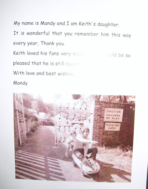 上映後にはキース・ムーンの娘マンディーから日本のファンにだけ送られたメッセージが紹介され、特別なこの日が記念すべき素晴らしい一日となった。マンディからの手紙には、マンディーが3歳頃にキース・ムーンと庭で遊んでいる微笑ましい写真が添えられていた(写真)。