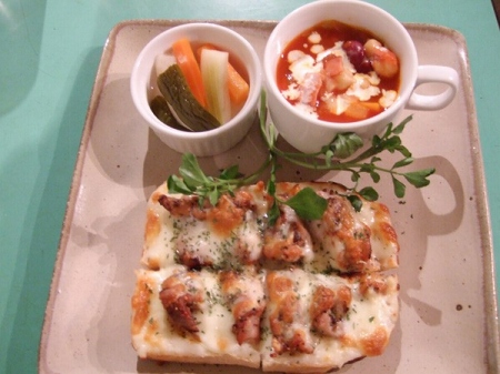 ガーリックソテーしたチキンをのせたクロックムッシュと、たくさんのお豆ミネストローネと、自家製ピクルス。コトリンゴは愛鳥家だが、“食べるのも好き。” とのこと。また、“コトリンゴには興味なくてもランチとデザートは本当に美味しいから是非食べにきて下さいね。(笑)” とは本人談。