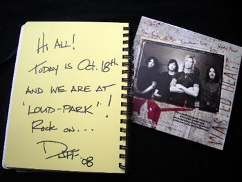 | ▲「やあ、みんな。今日は10月18日で、俺たちは『LOUD PARK』に居ます。ROCK ON! DUFF 08」……とキメてくれたダフだが、実はこのメッセージをもらったのは10月19日。彼がそこに居たことを証明する物的証拠としての価値、もしかしてゼロ? |