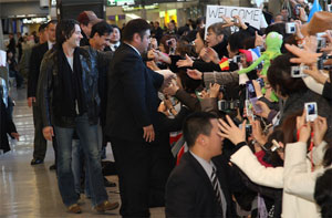 彼らを迎えたのは、大勢のイル・ディーヴォ・ファンたち。週明け月曜日の早朝にも関わらず、彼らの姿をひとめ見ようと、250人ものファンが成田に大集結。彼らが登場するなり、写真にプレゼントに握手にと大騒ぎとなり、一時パニック状態。そんな中でも、サービス精神旺盛な彼らだけに、ファンの熱い歓迎に快く応え、長旅の疲れも見せず、笑顔で日本のファンとの再開を喜んでいた。