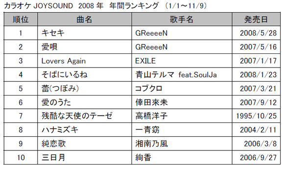 カラオケJOYSOUNDによる2008年の年間ランキングによると、1位と2位をGReeeeNが独占という結果となった。