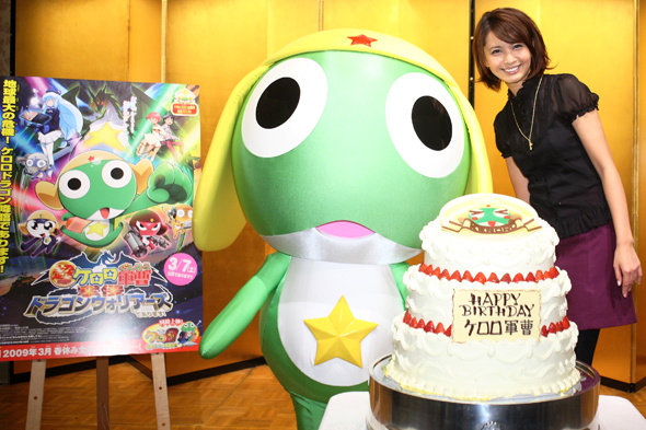 そもそも、ケロロ軍曹、今までちゃんと誕生日を祝ってもらえなかったため、この日は集まった多くのマスコミにご満悦の様子。そこに、2008年の3月7日(土)公開の映画『超劇場版ケロロ軍曹 撃侵ドラゴンウォリアーズであります!」のオープニングテーマ曲を担当する加藤夏希が花束プレゼンターとして会場に駆けつけた。