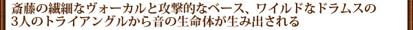 斎藤の繊細なヴォーカルと攻撃的なベース、ワイルドなドラムスの3人のトライアングルから音の生命体が生み出される