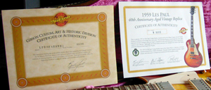 今回用意されているカラーは当時の発売時と同様のHeritage Cherry BurstとHeritage Dark Burstの2種類のみ、あわせて500本の完全限定生産となる。1999年の40thの時にはagedモデルのみ、もう一枚40thを表わす証明書が付属していた(写真)が、今回も50周年記念モデルを表わす証明書が付属するようだ。