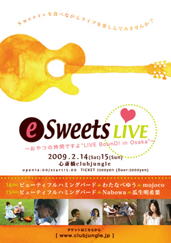 心斎橋club jungleにて開催される<e Sweets LIVE ~おやつの時間ですよ“LIVE BounD! inOsaka”~>は、“スィーツを食べながらライブを楽しんでみませんか?”という、なんとも嬉しいコンセプトの元に開催されるイベントだ。疲れているときや一息入れたいときに口にするスィーツは人の心を和ませてくれる…、そんな和みの気持ちとともに良質な音楽を楽しめたらどんなに素敵な時間になるだろう、と企画されたのが<e Sweets LIVE>なのだ。当日は美味しいスィーツが観客のもとへ運ばれ、それを食べながらライヴを楽しむことができるという。さいこー♪