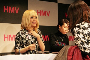 immiのサウンドメイクには欠かせない、N.A.i.D、JETBIKINIの両プロデューサー陣を従えてのイベントは「Crazy Cat」からスタート。イベントの模様は渋谷HMVの各フロアのモニターに流されていたが、別フロアでは早くもその映像に見入る買い物客の姿も見られるなど、注目度は上々なようだった。