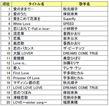 2位は倖田來未「愛のうた」、3位はSuperfly「愛をこめて花束を」、4位はSPEED「White Love」となり、キャッチーなメロディに乗せて、若い女性の恋心を歌い上げた曲も多くランクイン。このあたりは淡く若々しいラブソングの混戦状態となったようだ。