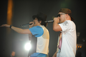 この日のアリーナは、とにかくハンパナイ豪華な客演が立て続けに登場。京都のR・レイティッドからRYUZO。名古屋から“E”QUAL。ベイサイドからTARO SOUL、さらにはレゲエ界からファイヤー・BのCHOZEN LEE。ZEEBRA。ペイジャーの復活で話題中のMURO。さらにはMUMMY-Dや竹内朋康、HI-Dが。そして、ニトロ・マイクロフォン・アンダーグランドが集結。