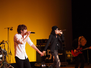 最新アルバム『#5』(ナンバーファイブ)がオリコン初登場7位の好成績を記録したFLOWが、2月25日(水)、ヴォーカルのKOHSHIとKEIGOの母校でもある武南高校の<予餞会>(卒業式に先立って高校三年生を送る会)でシークレット・ライヴを行なった。