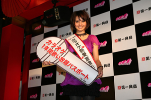 | ▲カラオケ愛へのお返し、また就任への感謝の意を込めて、第一興商から“カラオケ利用券1年間パスポート”がプレゼント。「ありがとうございます!これからカラオケにMC に頑張ります!」と加藤夏希。 |