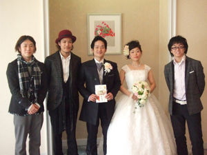 無事、スペシャルライヴを届けたメンバーは、「お祝いの席なので自分の発する言葉に緊張しました。幸せの門出なのでそのオーラを頂いて楽しく演奏できました」(渡和久)、「(渡が)言葉を間違えないか心配でした(笑)。2年前の自分の結婚式でバンド演奏したことを思い出しました」(中富雄也/Dr)、「会場の雰囲気が暖かくてよかったです。結婚式と一体になったライヴができました」(鳥口JOHNマサヤ/B)とコメントした。