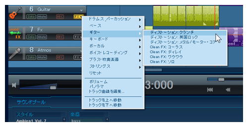 オーディオトラック用のエフェクト選択。楽器ごとに適したプリセットを用意。より細かいパラメータの調整も可能