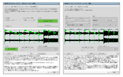 ビート検出(左)、ハーモニーエージェント(右)。ビート検出では、曲の頭を指定、1拍ごとにマウスクリック(タップテンポ)することでテンポを検出。シンプルな曲ならタップテンポなしでうまくいく。ビート検出後使えるのがハーモニーエージェント