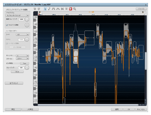 エラスティック。オレンジの線が検出された波形。微妙な上下がビブラートなどの表情を表わしている。灰色の四角が音程を示す。オレンジの線を書き換えたり、四角を上下したりすることで、さまざまな表情が生み出せる。Perfume風にロボットぽく人間らしさを押さえるには、オレンジの線を直線に、スムージングを極端に減らせばよい
