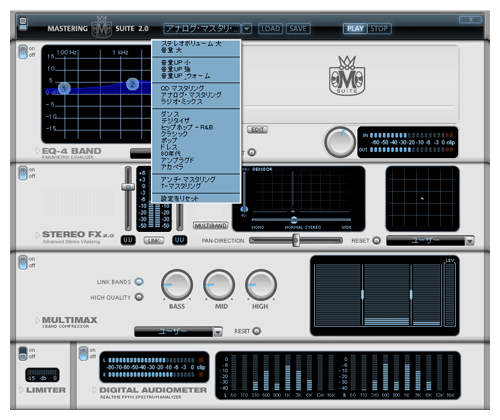マスタリングエフェクト。イコライザー、コンプレッサー、リミッターに加え、ステレオ感(広がり)を調整するエフェクトも装備。プリセットがあるので、そこから選ぶだけで使えるのがありがたい