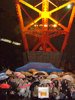 東京地区の会場となったのは東京タワー。当日は悪天候にも関わらず約300名が早くから集結。オンエアが始まると、まるで目の前でライヴが繰り広げられているかのような大歓声と拍手が。すると、時をあわせるかのように雨が上がり、スピーカーの前で目をつむって想像を膨らませながら聴くファン、時おり涙するファンの姿も見られた。