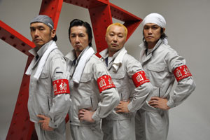 アラフォー4人衆、怒髪天が“春闘ライヴ”で労働党員バッヂを配布