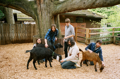 フリート・フォクシーズは、ロビン・ペックノールド(Vo./G)、スカイラー・シェルセット(G)、クリスティアン・ワーゴ(B)、ケイシー・ウェスコット(Key)、ジョシュ・ティルマン(Dr)の5人編成。平均年齢23歳という若さ溢れるメンバー…のはずだが、風貌は、5人中3人(ロビン、ケイシー、ジョシュ)が長髪に髭で、20代前半とは思えないルックス。ぎりぎり、スカイラーだけは爽やかアイドル風か? にしてもヤギと戯れる様子のアーティスト写真ってどうなんだ?