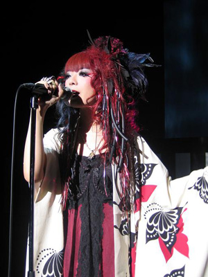 そうしたなかで、アンティークの赤いドレスにガーター、その上に「地獄少女」が着用している着物を羽織って登場した北出は、『地獄少女 三鼎』のオープニング・テーマでもある「月華-tsukihana-」を、招待客1000人の前で熱唱。