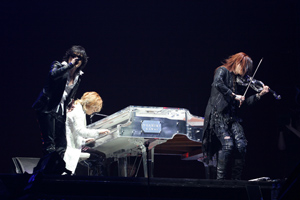 SUGIZOという鬼才の存在は、X JAPANの鼓動に鞭を振るった。まだ見ぬ新たな世界へ踏み出すためののトルクフルな血流がモンスターの体温を上げていく。SUGIZOが偉大な才能の持ち主であり、X JAPANに多大な影響を与える潜在能力を持っているのはいわずもがな。モンスターはこれまでにない光を湛えて頭をもたげた。「DAHLIA」で見せたYOSHIKIのピアノとSUGIZOのヴァイオリンによる静かなる嵐は、インストゥルメンタルの表現力を超えて、破壊と構築のX JAPAN美学をこれまでにない形で表現して見せた絶品の数分間。X JAPANが全てを乗り越えて、大きな一歩を踏み出したこの輝かしきパッションは、間違いなくひとつのピークの瞬間だった。
