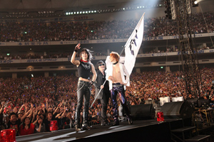 「Say Anything」をバックに、彼らは何度も何度も感謝の意をオーディエンスに伝えた。会場を走り、深々と挨拶を繰り返し、いくつもの「無敵」フラッグが空を切った。TOSHIとYOSHIKIがHEATHの両手をとり会場を走りながら、5万5千人のX JAPANへ笑顔を送り込んだ。HIDE人形はSUGIZOが守っている。