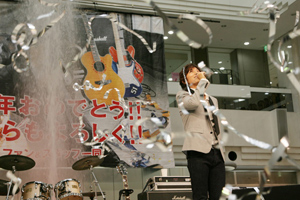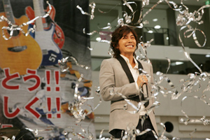 オープンスペースでのイベントは約4年半ぶりとあって、本人の登場を待ちかねるファンの期待感あふれる空気は、一触即発の緊張感に包まれ、ただごとではない程の雰囲気。司会の呼び込みと共に本人がステージに登場した時には、噴水広場1階から4階までが地響きがするほどの歓声に包まれた。