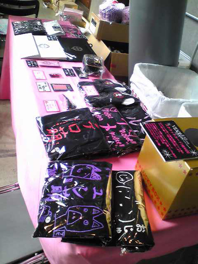 会場外の物販コーナーにも列ができています。メンバーそれぞれの名前が入った「萌えT」など、ファン心をくすぐるアイテムの数々。買いのがさないように。
