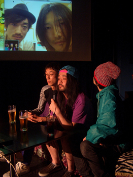 イベント開催時刻になると、東京会場には斉藤祐樹(Gt&Piano)、川崎“フィリポ”裕利(Dr&Per)、佐藤“コテイスイ”康一(Per&Dr)の3名が、大阪会場には須藤寿(Vo&Gt)、宮川トモユキ(Ba)の2名が登場。それぞれの会場で『D.V.D.H.i.G.E.』の映像を見ながら、ビデオ・クリップ撮影時の裏話などを披露し、来場したファンを喜ばせた。