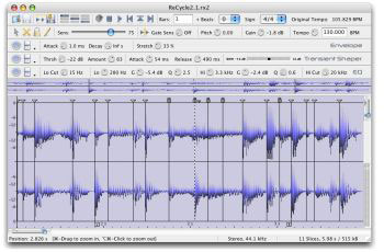 ReCycleは変換ユーティリティの一種で、オーディオデータをスライスと呼ばれる断片に分割して独自の「REX」形式で保存する。Recycleで作成されたREXファイルは、異なるテンポの曲で使用しても自動的にそのテンポに合わせることができるほか、1つのリズム・ループの中の個々の音を差し替えたり、並べ替えたりしてまったく別のリズムに組み替えてしまうことも可能だ。多くのDAWソフト、ソフトウェアサンプラーがREXファイルに対応していることが、その有用性を証明になっているといっていいだろう。