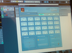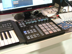 右スピーカーの手前がKORE 2コントローラ。パッド、ロータリーエンコーダーでカンタンに豊富なライブラリの呼び出しやリアルタイムエディットが行える