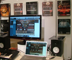 Liveでおなじみのハイ・リゾリューションは、Steinbergのイベントということでバーチャル・インストゥルメントをメインにしたラインナップ。EastWest製品のパッケージがずらりと並ぶ。EastWestの代表的な7製品をバンドルしたComplete Composer Collectionをはじめ、オーケストラ音源、バーチャル合唱団、中国・ペルシャ・インドに特化した民族楽器音源など、あらゆるジャンルの音源が揃っている。これらの音源はキーマップやベロシティで演奏方法の変更ができるので、手前に用意されたMIDI鍵盤でその奏法を実際に試せるようにデモされている。