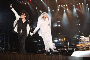そして、2度目のアンコールでTOSHIに手を引かれステージに登場したYOSHIKIは、なんとウエディングドレス姿。2人で花道を駆け抜け、その後衣装を脱ぎ捨てベールと共に客席に投げ込んだ。