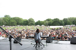 このひとことからLiveが始まったニューヨークでは非常に人気の高いストリート・バンド、Yaz Bandとのセッションで、まずは2曲。「Lover」、そして「MyLove」を披露。普通のバンド・サウンドとは違う、少しフュージョン・アレンジの効いたサウンドで、晴れ渡った野外で聴くには最高の演出だった。