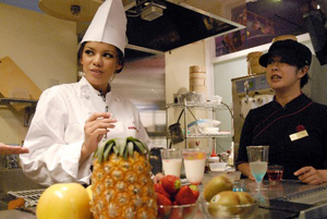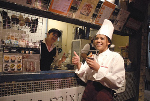 来園したジェイミーは、まず可愛い店内に大興奮。パティシエの衣装を着て次々と試食。ミキシン ミクスリームでは、塩キャラメルに初挑戦し、おいしさに感動。次にHONG KONGスイーツの果香へ移動し、こちらでも杏仁豆腐に初挑戦。パティシエのアドバイスを受けながら、リキュールなどをチョイスした。