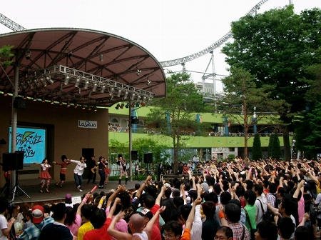 2009年4月から水曜夜7:26~のゴールデンタイムに移動したTVアニメ『イナズマイレブン』。子供たちの間で人気沸騰中のこのアニメのイベントが、 6月14日に東京ドームシティ ラクーアガーデンステージにて行なわれた。イベントには、同アニメのオープニングテーマを歌うT-Pistonz+KMC(ティーピストンズ プラスケムシ)とエンディングテーマを歌うBerryz工房、そしてアニメのキャラクターである円堂くん、豪炎寺くんが参加。ラクーアに来場している家族や子供達、ファン達と一緒に盛り上がった。
