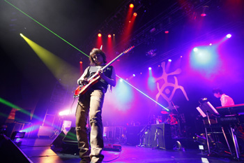 会場は、開演前から<TGE>5周年のお祝いに駆けつけたファンの熱気に埋めつくされていた。煌びやかな輝きを放つ紅いNew GuitarでDAITAが登場し、グルーヴ感が溢れるリズミカルなナンバー「Hybrid Gear」で公演は幕を開けた。