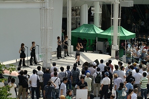 関東で35度を超えるなど、2009年一番の暑さとなったこの日。照りつける太陽の下、鍵山のミニライヴはスタート。MCのかつんかつんが、集まったオーディエンスのテンションを上げつつ、まずは鍵山由佳を応援する“かぎやま隊”こと、ヤンキーフォーが登場。普段は特効服姿だが、この日は鍵山由佳の応援団(かぎやま隊)のため、鍵山由佳がデザインしたタンクトップ姿で登場の彼女たち。鍵山由佳の応援練習などをコントで披露し、集まったオーディエンスから笑いを誘っていた。
