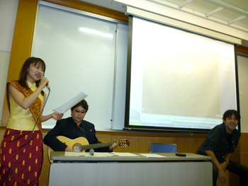 そして、GYPSY QUEENといえば歌。この日は、ベースのAKIとドラムのMASAO、そしてラオスの民族衣装シンを来たマネージャーのviviが参加。AKIのギターとMASAOのカホーンで、アコースティックなライヴを行なう。ラオスの国にはないという音楽という授業。NPO法人AEFAのソングであり、校歌のない国の子供たちのために創った「君と僕はともだち」を小学生と一緒に歌った。この曲は、ラオス語とベトナム語にも訳されていて、GYPSY QUEENがラオスを訪れたときは、10時間かけて会いに来てくれた現地の子供たちと一緒に歌ったこともある。そんな映像も流された。