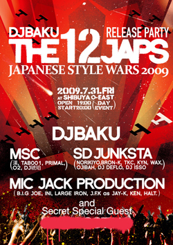 なお、7月31日は、アルバム『THE 12JAPS』のリリースパーティ<DJ BAKU『THE 12JAPS』-JAPANESE STYLE WARS 2009->が渋谷O-EASTにて開催となる。このアルバムへの参加MCのほとんどが集結するという奇跡の一夜、後世に語り継がれる歴史的イベントになることだろう。