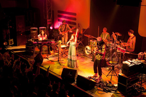 ライヴ開始からナガシマトモコは最高の笑顔を見せ、歌う、踊る、そして飛び跳ねる。それを見るだけでも今日のライヴに対する期待がググっと増し、どんどん引き込まれて行く。そんなナガシマは、「スパークル・ジャーニー」で今回初めて手にしたギターを弾き、「神秘」では「レコーディングで演奏してもらったんだけど、あまりに良くてツアーの1週間前に買った」という、先住民アボリジニの木管楽器であるディジュリドゥを披露するという場面も。