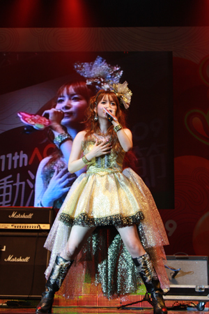 そんな香港人が待ちに待ったライヴのオープニング曲は、香港でも大人気のエヴァンゲリオン主題歌「残酷な天使のテーゼ」。曲を歌い終わり、大歓声の中のMCでは、流暢な広東語で自己紹介を行ない、会場から驚きの声があがった。広東語は本当にマスターするのが難しいが、彼女の広東語は通訳も太鼓判を押すほどだった。プライベートでは何十回も香港に来ているほどの香港フリークなのだ。