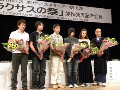 玄侑宗久:よりによって「アブラクサスの祭」というのには驚いたのですが。私の作品を読んで連絡を下さる方がいらっしゃいますが、この作品を読んで感銘を受けたという方は、小説がよっぽど好きな方か、アブナイ方が多いですね(笑)加藤監督はどっちなんだろうと拝見してましたら、どうやら両方のようです。しかしながら大変に読み込んで下さって、脚本家の佐向さんと協力して、素晴らしい脚本になっていると思います。今回の作品の場合は音楽というのが非常に重要だと思います。スネオヘアーさんが出演して下さっているので、音楽という点ではもう一つ期待しています。原作というのはきっかけでありまして、加藤監督を始め、みなさんの作品になりますので、私も一観客として楽しませてもらいます。