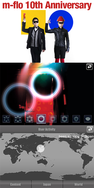 日本のメジャーアーティストとしては初となる、m-floの音楽入りのiPhone用アプリ「m-flo 10th Anniversary」には、m-floの代表曲9曲のショートバージョンが収録されており、楽曲を再生しながら画面をタップすると、タップされた地域と回数がGPSを使って世界地図/日本地図上にマッピングされる。地図上にマッピングされたタップ数は、今秋リリース予定のベスト盤の収録曲を決めるファン投票のデータとして反映される。まずは日本での発売となるが、海外でも順次発売予定となっている。