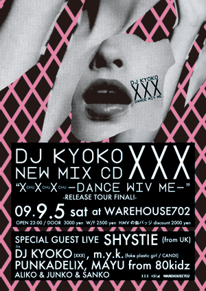 全国のダンス・フロアからラブ・コールが止まぬ新世代のアイコン・DJ KYOKOだが、7月15日にKSRからリリースされた初のオフィシャルMIX CD『XXX -Dance Wiv Me』のリリースツアー・ファイナルが、9月5日にWAREHOUSE702で開催となる。
