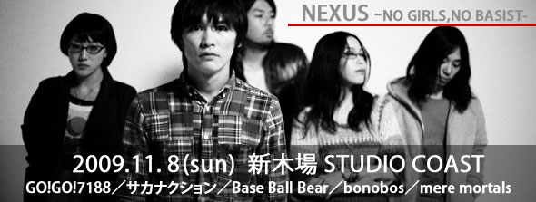 <LIVE MUSIC ism>改め<NEXUS>は、発表と共に、まず2days2日目の詳細が明らかとなった。出演バンドは、GO! GO! 7188/サカナクション/Base Ball Bear/bonobos/mere mortals(from L.A.)というラインナップ。…そう、既にお気付きだろうか。<“NO GIRL, NO BASSIST”~女性ベーシストバンドのNEXUS~>というコンセプトのもと、女性ベーシストが在籍するライヴバンドが一同に揃うのだ。