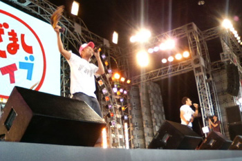 ステージに登場するなり「夏が始まるぞー!」という珍MCで会場に火を付けるDJケミカルに負けじと、歌いながらステージセットの鉄塔を最上段まで登るという説教覚悟のパフォーマンスで火に油を注ぐファンキー加藤。そこにモン吉の絶妙なリリックが響き渡り、お台場をファンモン一色に染め上げた。