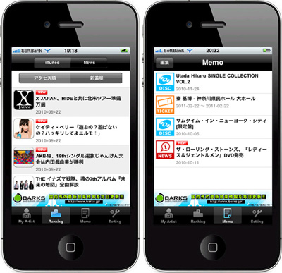 | ▲ランキングのコーナーでは、iTunesの楽曲情報とBARKSのニュースを掲載。ニュースは最新順と読まれている順で表示(左)。情報は簡単にメモできる。登録も抹消もカンタン。備忘録に便利(右)。 |